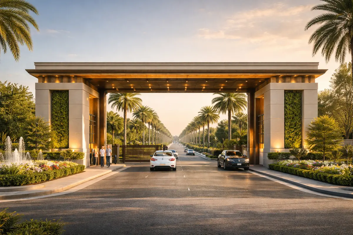 The project functions as a gated community with controlled access points. Entry and exit movement follow planned routes. Security covers shared spaces and internal roads. Street lighting supports safe movement after sunset.